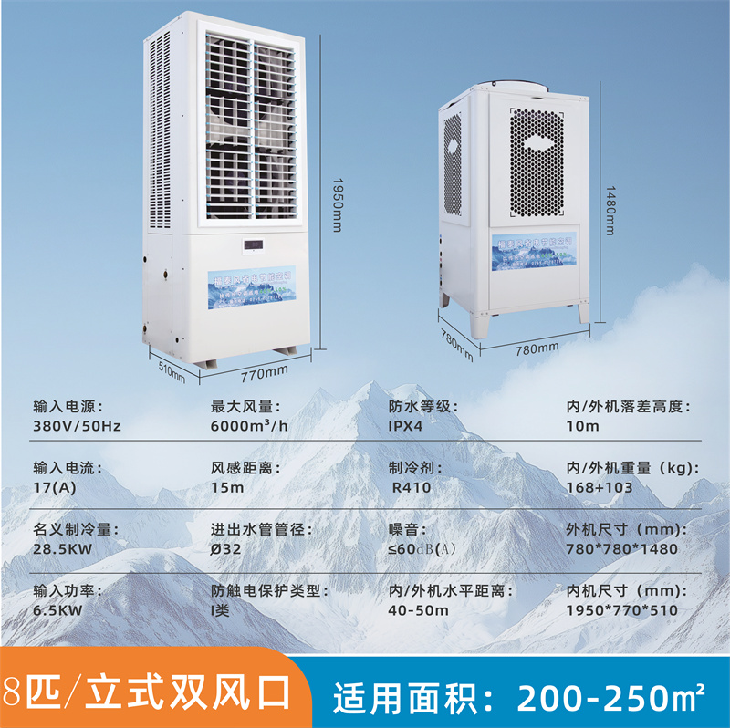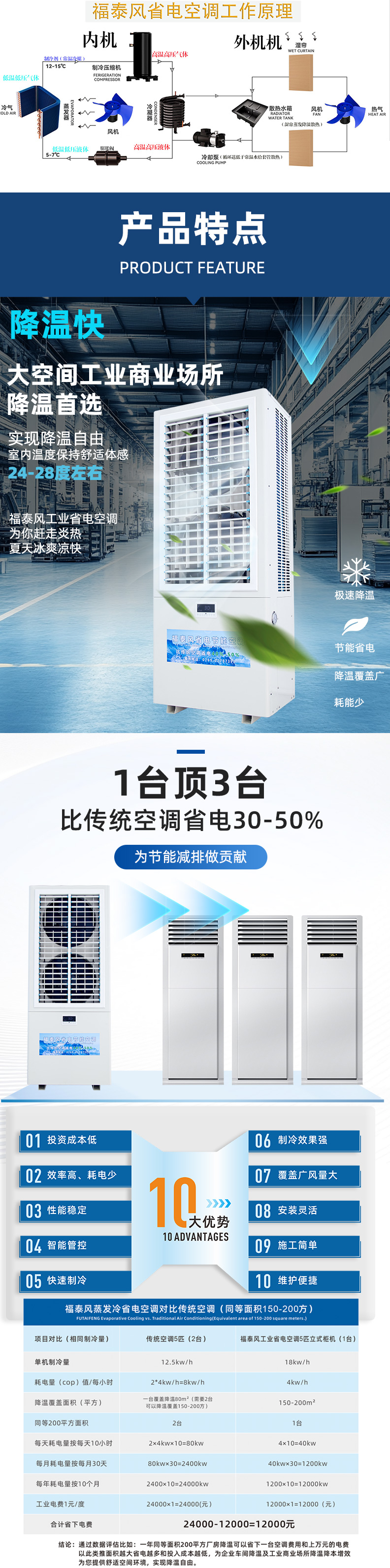 超級節能省電、同等面積安裝比傳統空調省電30~50%,覆蓋面積大一臺5P的可以覆蓋200個平方車間降溫,出風口溫度可以做到13-16度。車間溫度可做到20-26度適合人體體感溫度。